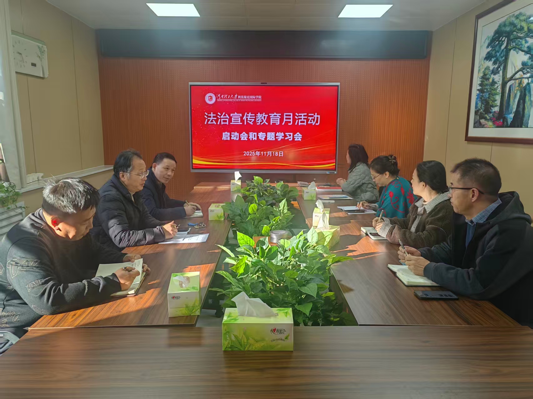 为深入贯彻落实习近平法治思想,扎实推进教育系统“八五”普法规划在学院落地见效,切实提升依法治校水平与教职工法治素养,11月18日,利莫瑞克国际学院在学院202会议室召开2025年法治宣传教育月活动启动会,并同步举行专题学习会。会议由学院党委书记张长森主持,全体教职工参加。