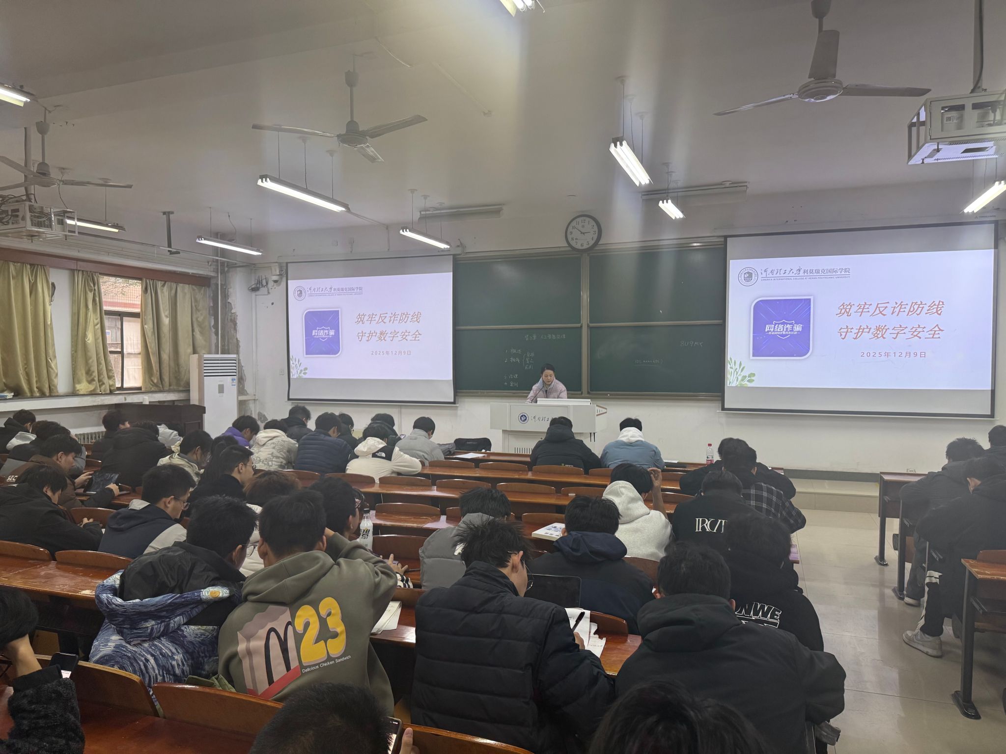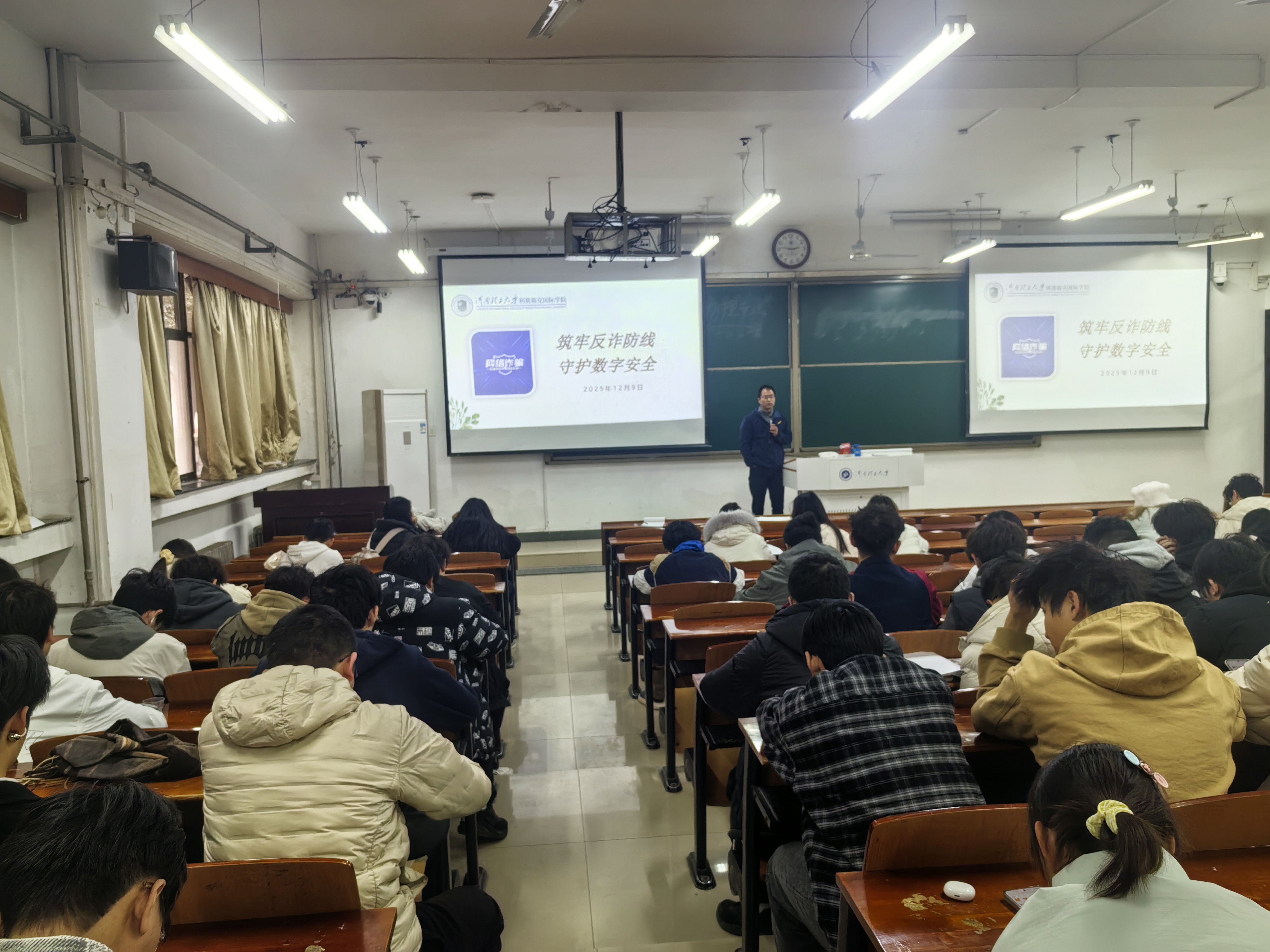 为有效遏制电信网络诈骗案件的高发态势,切实增强学生的网络安全意识和防骗能力,2025年12月9日,利莫瑞克国际学院在三号教学楼3106、3107教室举办了以“筑牢反诈防线 守护数字安全”为主题的教育班会。学院辅导员桂伟峰、李瑶锦及各年级学生共同参加了本次班会。