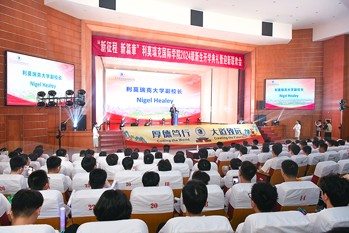 本网讯 与世界牵手,让梦想起航。9月6号下午,利莫瑞克国际学院2024级新生开学典礼暨迎新联欢会在校明德楼音乐厅举行。校党委书记邹友峰、党委副书记解伟,副校长李振华、边亚东等校领导,爱尔兰利莫瑞克大学副校长Nigel Healey(奈杰尔·希利)等一行,学校相关职能部门和学院负责人,以及来自全国15个省份的197名本科生及部分学生家长,共聚一堂,共同开启华彩篇章。