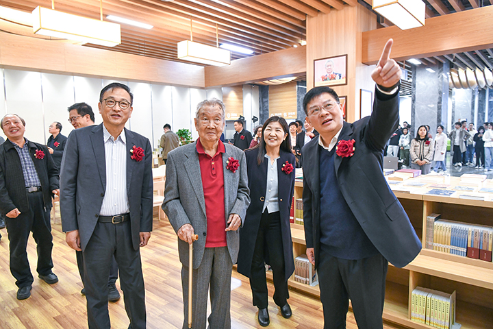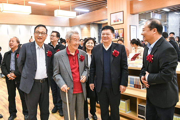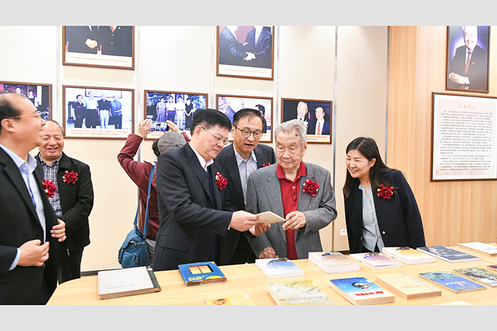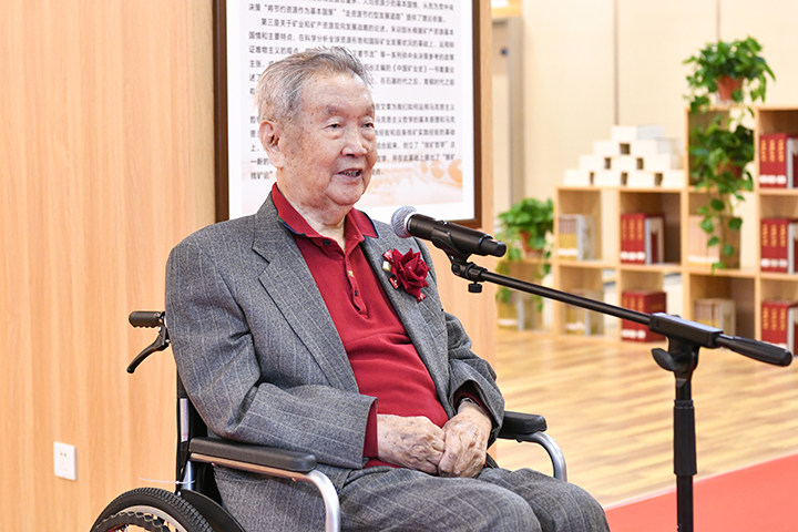 “朱训书屋”藏书共计千余册,主要包括朱训先生人生奋斗历程回忆录、矿产资源国情的研究与分析、矿业和矿产资源双向发展战略的论述、找矿哲学等四类,涉及政治、经济、文化、哲学、地球科学、地质勘查、矿产资源、矿业开发和矿政管理等诸多领域,既是朱训先生人生奋斗轨迹的真实写照,也是他在地质勘探实践与哲学思考的系统总结,对师生开展相关领域研究具有重要的价值。此次“朱训书屋”揭牌仪式见证了朱训先生对学校建设发展的关心和支持,对高等教育事业的强烈责任感,也激励着全体师生大力弘扬践行科学家教育家精神,踔厉奋发,勇立潮头,为加快学校双一流建设作出更大贡献。